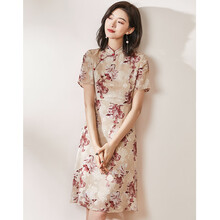 小个子旗袍少女款改良旗袍连衣裙新款夏复古民国风气质中长款裙子汉服女 杏色 S