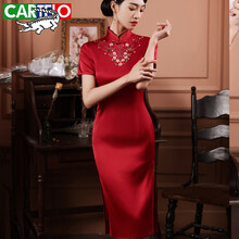 卡帝乐鳄鱼轻奢品牌 中长款旗袍婚礼喜妈妈装气质婆婆礼服刺绣醋酸缎高贵端庄显年轻红 326J红色 S
