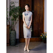 仿真丝旗袍裙女中长款2021夏季新款中国风旗袍复古日常修身少女年轻改良旗袍连衣裙气质优雅旗袍雅旗依 82148兰 M
