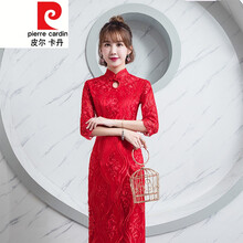 皮尔卡丹 (轻奢高端)旗袍敬酒服新娘结婚2021春夏季红色改良修身少女中长款大码女针织 红色中长款 S