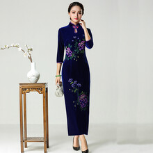 凡香云改良长款金丝绒旗袍婚宴中年女婚礼妈妈装演出服走秀优雅气质喜婆婆装结婚礼服818 宝蓝 S