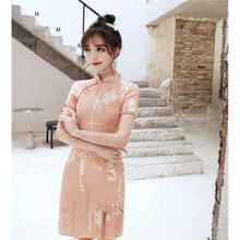 旗袍女2021新款春夏四面弹前开叉短款旗袍连衣裙年轻少女日常改良旗袍 2123 浅粉 S