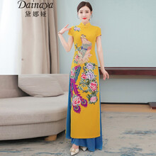 黛娜娅 旗袍女2021夏季新款优雅气质中式女装中国风日常改良复古旗袍演出服中长款刺绣连衣裙 3277 黄色 M