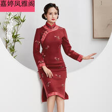 倾城粉黛冬季毛呢旗袍长袖中长款改良时尚修身优雅红色礼服裙 酒红色 S