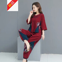 轻奢高档素订品牌中式唐装套装女复古民族风刺绣提花棉麻上衣阔腿裤亚麻两件套 215款套装 酒红色 XL