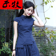 示牧品牌女装中式服装民族风女装民国短袖旗袍唐装套装女上衣夏装复古棉麻茶服 短袖套装 M舒适柔软