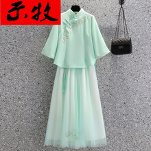 示牧品牌女装中国风女装改良汉服女刺绣唐装上衣两件套民族风套装民国风茶服夏 套装(绿上衣+绿裙子) M