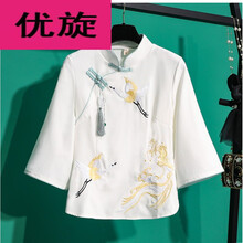 中国风仙鹤刺绣斜襟棉麻旗袍上衣民族茶艺服装唐装女复古改良汉服q 白色 送吊坠 M
