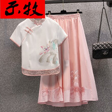 示牧品牌女装短袖唐装女夏民族风印花蕾丝拼接棉麻两件套中国风女装学生民国风 粉色上衣+粉裙【套装】 L