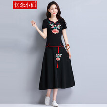 忆念小仙2021夏季新款汉服女古装改良唐装古风女装民族风绣花复古短袖套装 黑色上衣+黑色半身裙(两件套装) XL.