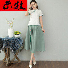 示牧品牌女装民国改良汉服旗袍上衣中式唐装短袖套装女夏中国风复古棉麻茶艺服 白色上衣+0852浅绿裙子【两件套】 L