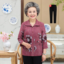 老奶奶夏季唐装短袖60-70岁老人家夏天穿的中老年人大码衬衫200斤春装女上衣 七.分袖翻领红腊梅【上衣+裤子】 XL(90-105斤左右)