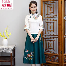 旗袍女汉服刺绣连衣裙女民族风唐装夏季中国风复古少女旗袍古装女 二号色【刺绣套装】 XL 建议:105~115斤