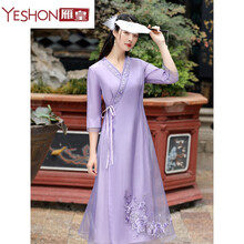 雁皇YESHON轻奢高档品牌夏改良唐装中国风女装禅服女古风修身复古连衣裙新款 冰清玉洁-紫 XL