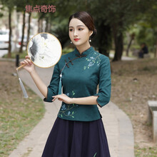 焦点奇饰 民国手绘女装中式唐装七分袖复古风茶服汉服中国风改良旗袍上衣春 墨绿 4XL