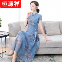 恒源祥彩羊旗袍2021年新款夏季唐装中国风复古真丝桑蚕丝新式改良版连衣裙女 蓝色 2XL