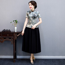 2021夏新款中国风中年妈妈旗袍上衣两件套汉服女装改良唐装套装裙莲衣群子孑传统祺袍时尚漂亮新款 灰套装 L