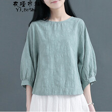 衣瑾帛社T恤女2020年提花棉麻灯笼袖七分袖T恤女短款上衣简约文艺范夏季女装 青绿色 均码尺寸(cm)胸围102衣长59肩宽35袖长40