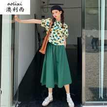 澳利西日系连衣裙套装少女夏装2021年新款初中高中学生森系学院风长裙子少女装初中学生高中生大学生装社 碎花衫绿裙两 M