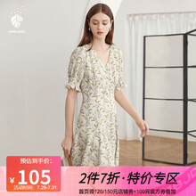 范思蓝恩 夏新款V领雪纺连衣裙收腰显瘦温柔风气质碎花裙子 白底紫花 XS