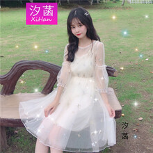汐菡新品女装连衣裙女夏学生甜美偏日系学院风初中高中生夏天亮片重工闪亮星星仙女裙+吊带裙两件套套装 图片色 均码
