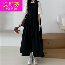 沃斯芬12-20岁青少年中大童大学生背带裙子少女夏季2021新款初中高中学生日系可爱连衣裙长裙JK套 白色衬衫+黑色连衣裙 L