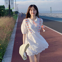 青春少女社会女生民族风镂空连衣裙女夏季新款法式复古可爱日系初恋泡泡袖裙子初中生高中生大学生 白色 均码