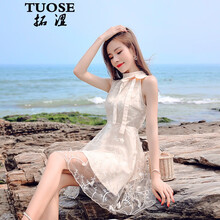 拓涩(TUOSE)网纱露肩连衣裙夏季新款香港潮牌修身显瘦气质日系温柔风仙女小个子a字短裙 杏色 L