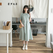 连衣裙女日系夏季新款娃娃领单排扣学生宽松显瘦学院风短袖a字裙 浅绿色 XL