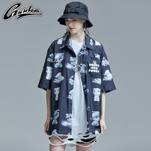 GUUKA国潮卡通云朵印花短袖衬衫女潮牌2021夏装新品街头日系少女嘻哈情侣休闲5分袖满印宽松衬衣女 黑色 XL