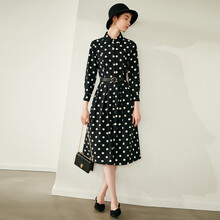 颜域复古波点衬衫收腰连衣裙女2021秋装气质中长款显瘦裙 黑色 L/40