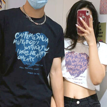 【两件装】泛哥 情侣装夏季2021新款宽松潮流情侣短袖男女学生韩版T恤套装休闲百搭半袖衣服 (爱心)黑色男+短款白色女 男M/女M