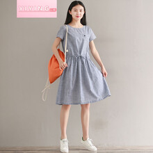 以影夏天连衣裙女学生初中高中生穿的裙子夏季新款女装小清新棉麻短袖连衣裙中学生收腰文艺日系少女裙子 图片色 L
