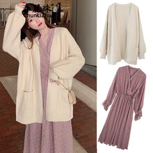 春麗珠连衣裙套装女2021秋冬新款女装韩版时尚V领长袖针织衫秋季女装外穿日系毛衣开衫外套两件套套装裙 毛衣+连衣裙套装 L(建议100-120斤)