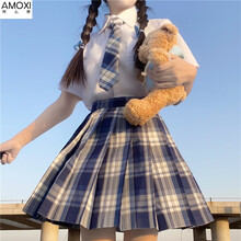阿么茜夏天初中学生日系JK制服百褶短裙套装少女夏装2021新款学院风连衣裙子 纯棉款短袖衬衫+格裙三 S