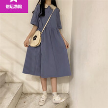 枳之家夏季款娃娃领连衣裙女学生韩版高腰百搭中长款日系双领仙女裙子 蓝色收藏店铺下单随机赠送小礼物 M 91-104