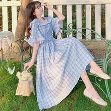 墨汁墨水 蓝色长裙法式温柔风日系桔梗裙夏大码胖mm高腰显瘦ins超火连衣裙 蓝白格 4XL【170-200斤】
