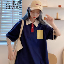 茨米萨 夏天翻领短袖T恤女生2021新款夏季学院风初中高中学生上衣服韩版宽松百搭POLO衫日系体恤D 藏青色 L
