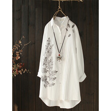 胖武林白衬衫女春夏季新款休闲文艺范宽松褶皱刺绣棉麻衬衣女中长款前短后长打底衫 白色 均码