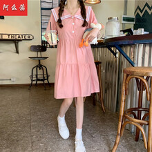 阿么茜夏天日系连衣裙少女生夏装2021新款初中高中学生海军领学院风森系裙子 粉红色 S