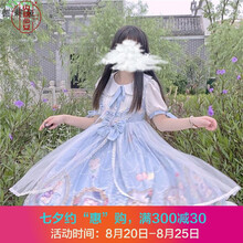 洛丽塔lo裙萝莉塔裙子厂原创日系甜美Lolita猫咪家族印花高腰网纱拼接OP短袖连衣裙女夏 海天蓝色 S