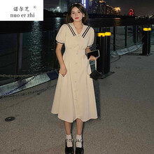 诺尔芝 裙子少女夏装2021新款初中高中学生日系收腰长裙学院海军风连衣裙 米杏色长款 L