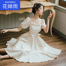 花婵雨 连衣裙子女学生少女夏天大学生女装夏季新款气质赫本风法式复古桔梗裙宫廷风仙女裙 杏色 S