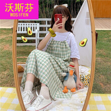 沃斯芬12-20岁青少年中大童大学生背带裙子少女夏装2021年新款初中高中学生日系格子吊带长裙连衣裙 绿格裙子 L