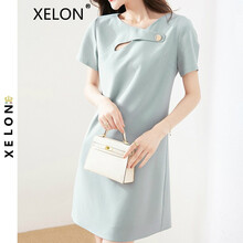 XELON高腰连衣裙夏季新款圆领显瘦时髦百搭优雅醋酸日系女装 浅蓝色 S