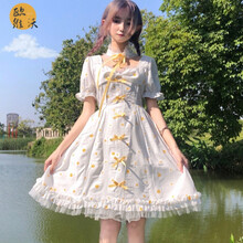 洛丽塔春夏新款日系方领可爱甜美风蝴蝶结系带小雏菊连衣裙女 短袖 均码