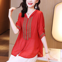 晴恋夕云衬衫女2021夏季新款百搭民族风连帽衬衫女 红色 L【建议105-115斤】