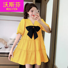沃斯芬155小个子女装150矮个子日系修身连衣裙女夏2021年新款气质减龄蝴蝶结V领泡泡袖衬衫裙子 黄色 M