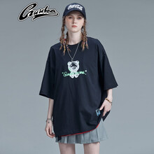 GUUKA潮牌荧光印花小熊涂鸦短袖T恤女ins潮牌2021夏装新款日系嘻哈情侣中性风半袖宽松运动上衣 黑色 XXL
