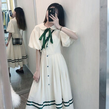 冉婉连衣裙女学生韩版原宿风长裙夏桔梗裙超仙女森系中长裙学生闺蜜装裙子夏季过膝可爱日系礼服文艺 米白绿 L